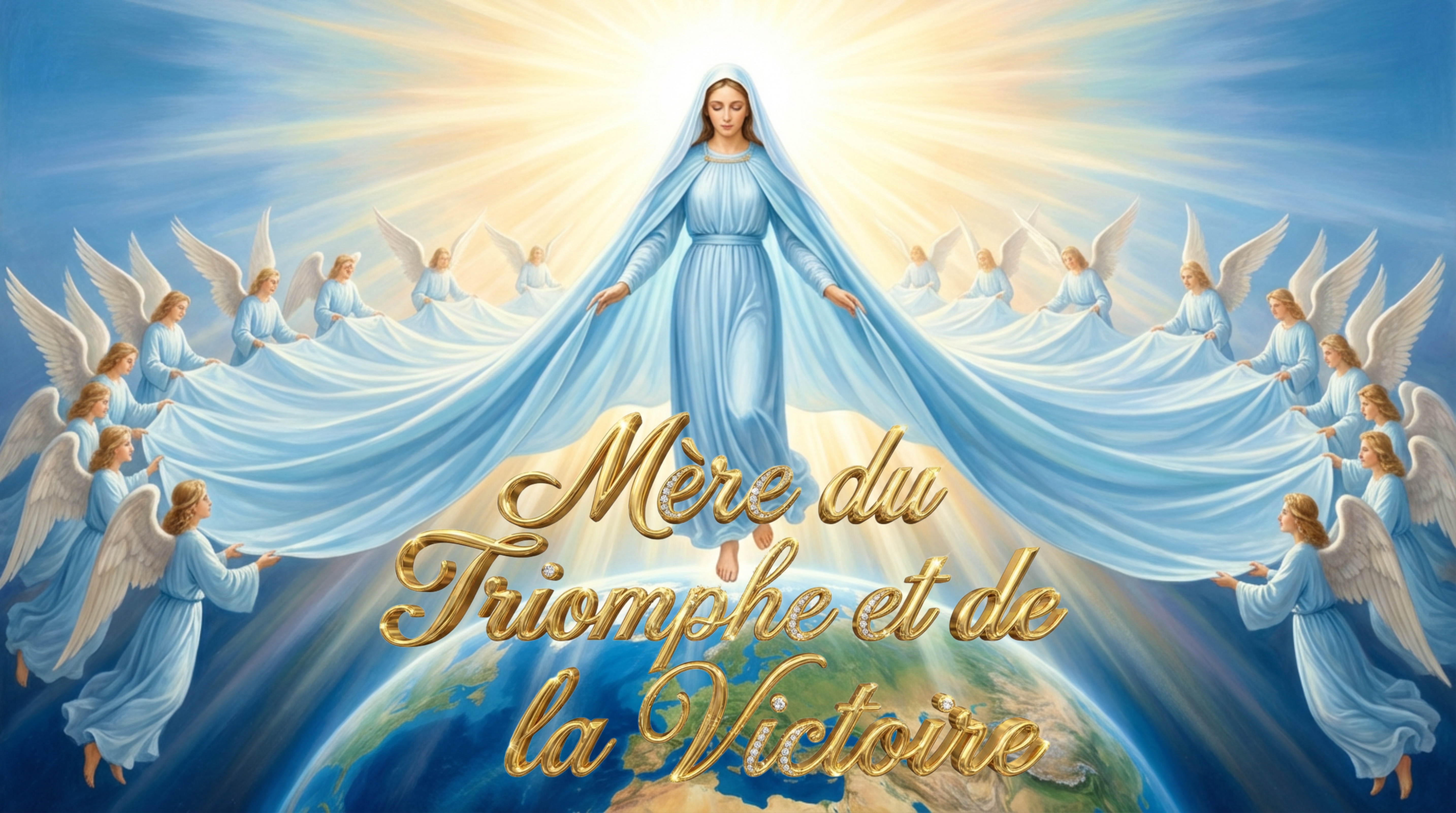 Après une expérience de mort imminente, j’ai fondamentalement changé de vie. Un an après mon pas concret de conversion, par la confession et l‘eucharistie, le 26 janvier 1996, alors que j’étais en prière, Dieu me montra dans une merveilleuse apparition, Marie Reine du Ciel et notre mère qui aide ceux qui se tournent vers elle. Je fus d’abord entouré d’esprits mauvais. que je voyais. Tout à coup, ils se sont éloignés de moi puis j’ai vu comme un ange descendre jusqu’à nous. Il tenait quelque chose : je ne savais pas encore ce que c’était. Il s’inclinait respectueusement. Derrière lui, je percevais encore plus d’anges qui faisaient la même chose que lui. Alors, j’ai regardé lentement l’ange de droite dans la direction où il se dirigeait et j’ai pu voir un très grand manteau si grand que c’était comme si l’on voyait une mer ouverte. Il fut étendu par les anges. Soudain, j’ai vu les pieds de la Ste Vierge et le bas de sa robe qui avait la même couleur que le manteau et que les anges : bleu ciel. Elle planait là, calmement et cela me fascina : ses pieds n’étaient pas chaussés. Je savais que cela devait avoir une signification importante. A présent je sentais une immense majesté et je fus saisi par un profond respect si bien que je n’étais pas capable de regarder vers elle. Pourtant mon regard et moi-même furent lentement élevés vers elle. La reine du Ciel avait ouvert un peu les bras et regardait le monde au loin. Son visage était merveilleux, sérieux mais gracieux, ses yeux marron clair/verts et limpides. Je n’ai jamais vu nulle part ailleurs d’aussi beaux yeux. Je crois que si elle m’avait regardé directement, je serais mort de bonheur. Ensuite mon regard la dépassa, comme si je voyais l’univers. Là, j’ai vu au dessus d’elle une immense couronne de lumière. Je me suis approché de cette couronne et j’ai pu constater qu’elle était formée de millions de petites lumières comme des étoiles scintillantes. Je voyais que c’était les habitants du ciel, les anges, mais aussi les hommes qui avaient été sur terre comme nous, qui, dans la jubilation, couronnent leur reine, la gloire de Dieu. Lorsque j’ai demandé qu’ils nous prennent sous son manteau, la vision s’est estompée pour moi pourtant je sentais encore son manteau. A ce moment-là, rien ne m’a été dit sur ce que je voyais et je savais que je ne pouvais encore rien dire, tout en pressentant que j’aurais un jour la signification profonde. En février 1997, j’ai dessiné une image de la Ste Vierge et rédigé une prière de libération que j’ai ensuite fait imprimer. Sur le chemin de l’imprimerie, Marie me fit savoir à ce sujet que l’ennemi me persécuterait pour cela ; elle me laissa libre de faire ce que je voulais et était très compatissante. Je fis donc imprimer cette image car je le voulais et je savais que cette aide proposée par Marie, notre mère spirituelle, serait possible pour chacun. Peu de temps avant, il arriva que la foudre traversa la maison de haut en bas, comme si un gros éboulement avait frappé le toit. On peut toujours en voir les traces : le planché éclaté sur 2 étages. Cet événement continuait régulièrement à me préoccuper. En 2003, j’ai fait redessiner l’image par une artiste. Avec cela j’avais en pensée qu’elle ( Marie) était la Reine du ciel et qu’elle serait bientôt celle de la terre entière. Un jour j’ai entendu, venant de l’image : « Je suis la mère du triomphe et de la victoire » Cela a duré un peu. D’autres personnes ont ensuite aussi rapporté que Marie agissait de façon sensible à travers son image et sa parole. Elle le fait même si ce n’est pas toujours directement ou immédiatement. Au fil du temps, Marie a commencé à me communiquer des choses pour tout le monde. La vie avec elle est concrète et vivante et nous présente le sens de la vie sur Terre car avec elle nous sommes déjà près de Dieu.. Ce n’est pas non plus ce qu’il y a de plus facile mais c’est ce qu’il y a de plus beau et c’est la volonté de Dieu : ça finit auprès de Lui, au Ciel, dans le bonheur sans fin. Marie est l’image et le modèle pour les hommes sauvés sur la terre. Elle est victorieuse avec son fils et est devenue la mère des Chrétiens ; c’est l’enseignement de l’Eglise et nous voyons tous combien nous avons besoin d’elle. Sous le manteau de Marie nous obtenons d’avoir part à sa victoire. Demandons-lui toujours de nous prendre sous son manteau et confions-nous à elle. Elle (Marie) a déjà été montrée à la Bienheureuse Anna-Katharina Emmerick „Je vis au-dessus de l’église devenue petite une magnifique femme dans un manteau bleu ciel largement étendu avec une couronne d’étoiles sur la tête. D’elle venait la lumière qui continuait à pénétrer dans les ténèbres. Là où pénétrait la lumière tout devenait nouveau et florissant. » Une autre fois, Anna-Katharina Emmerick a vu comment la cathédrale St Pierre était détruite ( image pour la destruction spirituelle de l’Eglise) : « Là j’ai vu une femme majestueuse qui déambulait sur la grande place devant l’église. Elle tenait son ample manteau avec ses deux mains et planait silencieusement vers le haut. Elle se tint sur la coupole et étendit largement son manteau sur tout l’espace de l’église. irruption avait apporté un peu de calme. Et voici que les démolisseurs voulaient poursuivre mais ils ne pouvaient en aucune façon s’approcher du manteau. De l’autre côté cependant apparu l’immense activité de ceux qui construisaient…. » (Extrait du Livre des Visions, Editions Pattloch, Buch der Visionen, Pattlochverlag) les 7 signes la Sainte Vierge, les pieds déchaussés, le manteau, la gloire, la couleur bleue, l’univers La Sainte Vierge Elle est le grand signe de l’Amour de Dieu. Elle certifie et vit cet amour, l’amour envers nous. Il est en elle et v